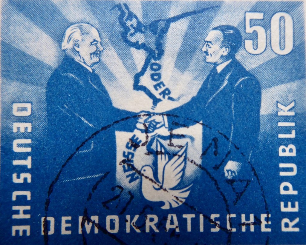 Noch ein Nachsatz zur „Oder-Neiße-Friedensgrenze“, wie sie später in der DDR immer genannt wurde: auf der Briefmarke der Deutschen Post der DDR aus dem Jahr 1951 reicht Präsident Wilhelm Pieck dem polnischen Ministerpräsidenten Bierut über die „Friedensgrenze“ hinweg die Hand. Das Bild täuscht. Pieck und Ulbricht, die kommunistischen Politiker der ersten Stunde in der sowjetischen Zone, haben sich bei den Russen über den Grenzverlauf im Oder-Mündungsgebiet beschwert, aber das war erfolglos.