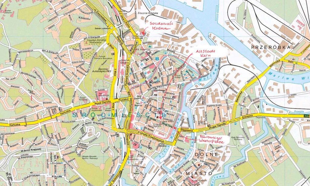 18 km zu Fuß | Start am Hotel: 10:00 | Vom Rand der Altstadt (Große Mühle) ging es für uns zuerst zum Solidarność Museum, dann auf einen Kaffee am Ufer der Motława und über die Wyspa Spichrzów (Speicherinsel) zum Fähranleger am Grünen Tor, von wo aus wir in Richtung Westerplatte starteten