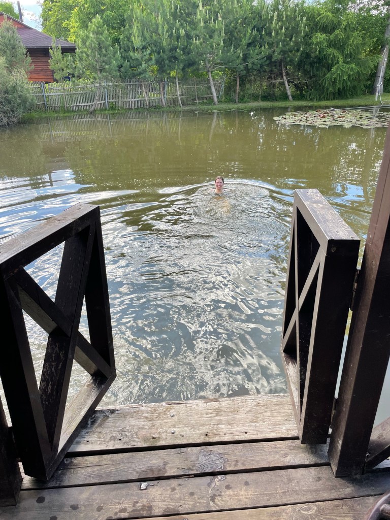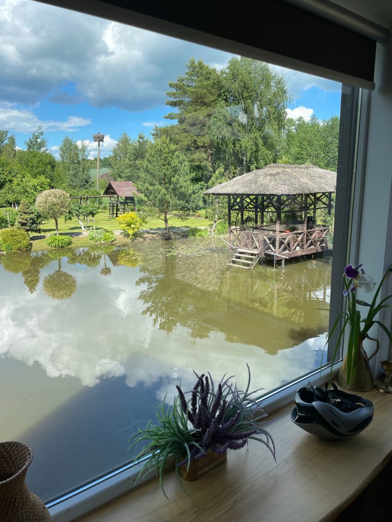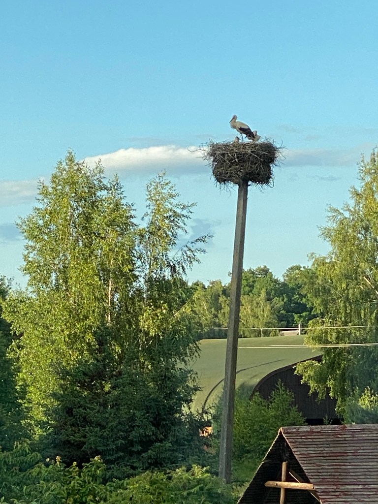 - Unsere tolle Unterkunft heute Nacht, ein stylisch eingerichtetes Holzhaus im Garten von zwei älteren Litauern mit Blick auf den Fisch- und Badeteich und das Storchennest 😍.