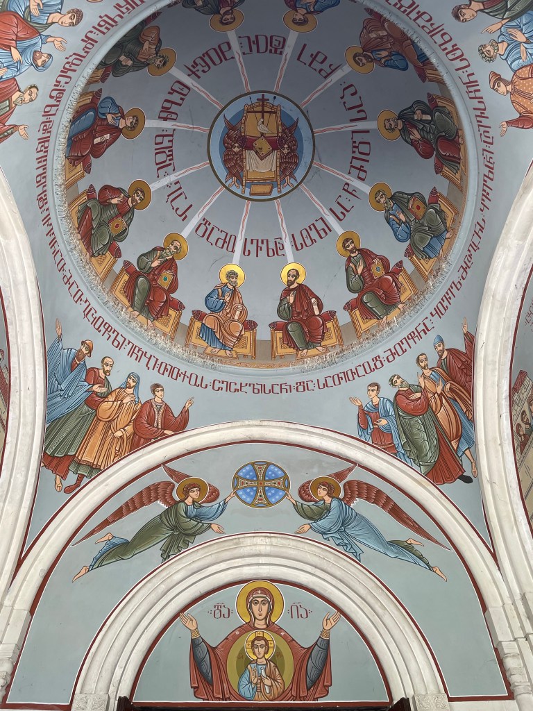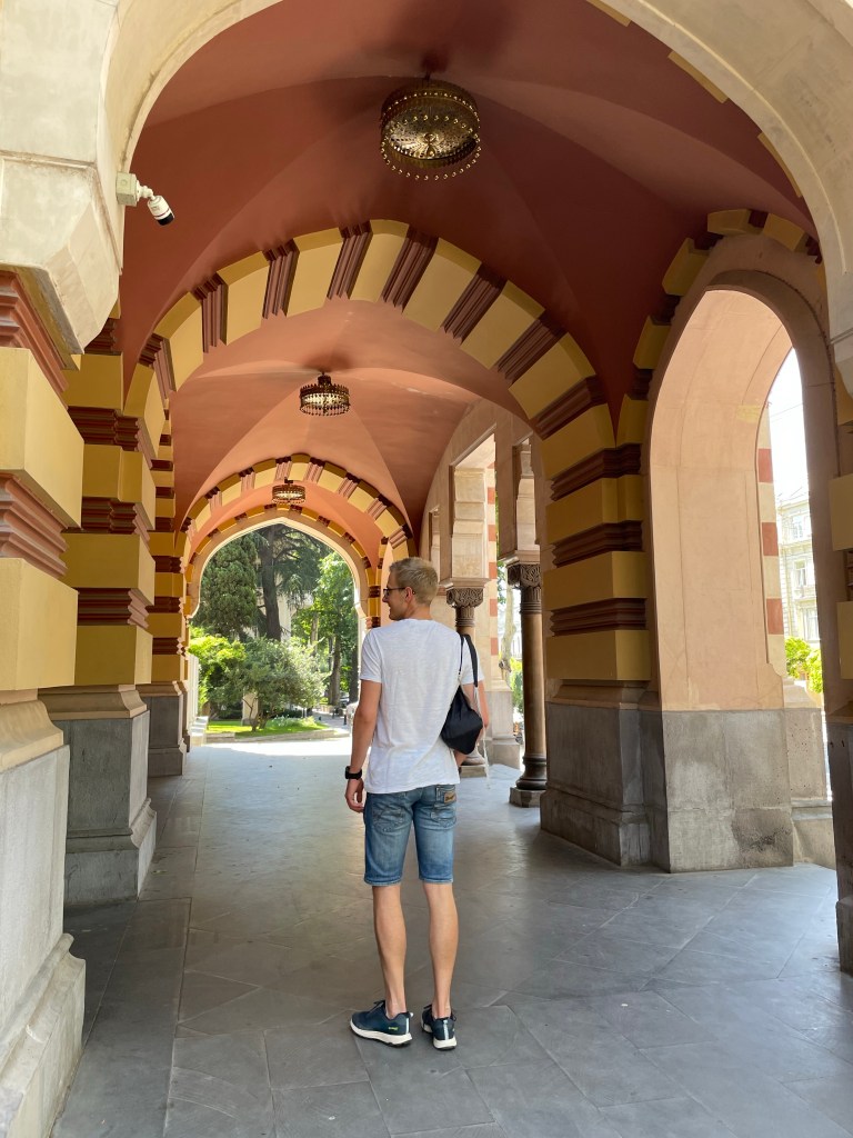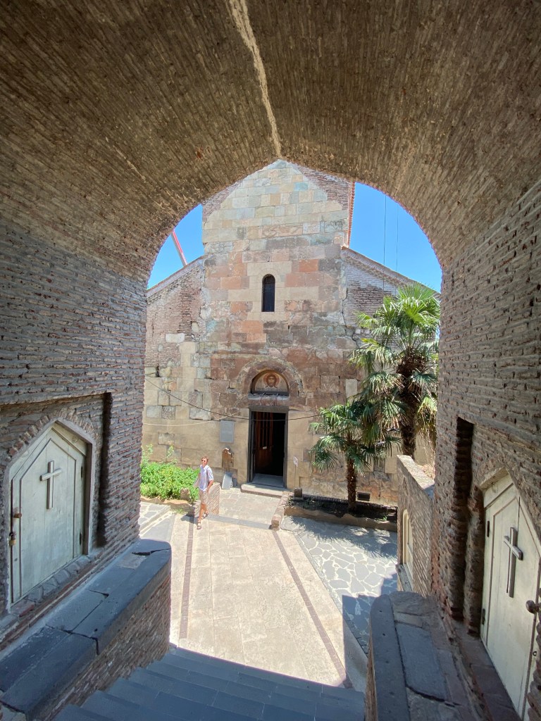 Auch die älteste Kirche der Stadt bekamen wir zu Gesicht. Übrigens gibt es für die christlich-orthodoxen Kirchen eine Kleiderordnung: Männer müssen Schultern und Knie bedecken, Frauen Schultern, Knie und auch das Haar (und am besten einen Rock und keine Hose!). Aber wie unser Guide treffend bemerkte, er könne das “Patriarchat” (so werden die Obersten der orthodoxen Kirche in Georgien genannt) nicht ernst nehmen, sie seien gegen Gleichberechtigung in jedweder Form, aber würden gleichzeitig auch das neueste iPhone nutzen. Am Tor zum Patriarchat erzählte er uns auch ein bisschen was zur georgischen Sprache. Auf Georgisch heißt Georgien nämlich gar nicht Georgien, sondern Sakartvelo. „Sa-o“ = der Ort, wo … leben und „kartvel-i“ = die zentrale Region Georgiens. Mit Litauen hat Georgien ein Abkommen, sich gegenseitig mit dem landestypischen Namen zu adressieren, also Lietuva und Sakartvelo.