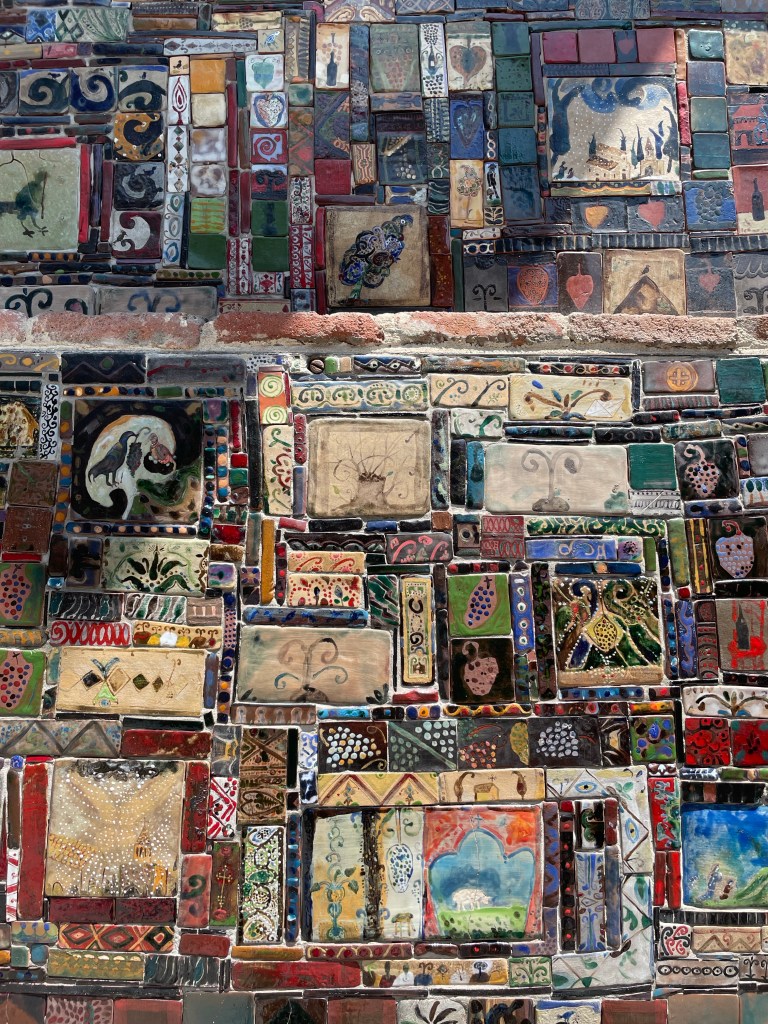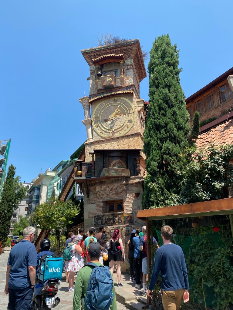 Der Guide – Nika, etwa in unserem Alter und gebürtig aus Tbilisi – hob auch die Bedeutung der Balkone als Ort der Begegnung und Kommunikation hervor. Außerdem konnten über die verbunden Balkone BewohnerInnen zu Zeiten des Kommunismus’ vor Verfolgern flüchten. Durch einen Laubengang aus Weinreben, die hier übrigens fast jeden Balkon begrünen und aus denen viele Georgier ihren eigenen Hauswein herstellen, ging es zum einem Gebäude, das mich irgendwie an Hundertwasser erinnerte: der erst 2010 fertiggestellte Uhrenturm mit Marionettentheater. Die Inschrift an dem Gebäude sagt so viel wie: “Mögen deine Tränen nur fließen, während du Zwiebeln schneidest”.