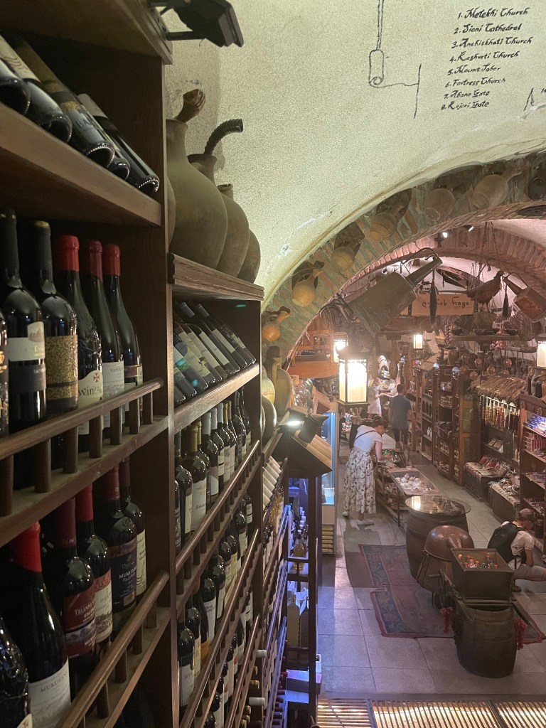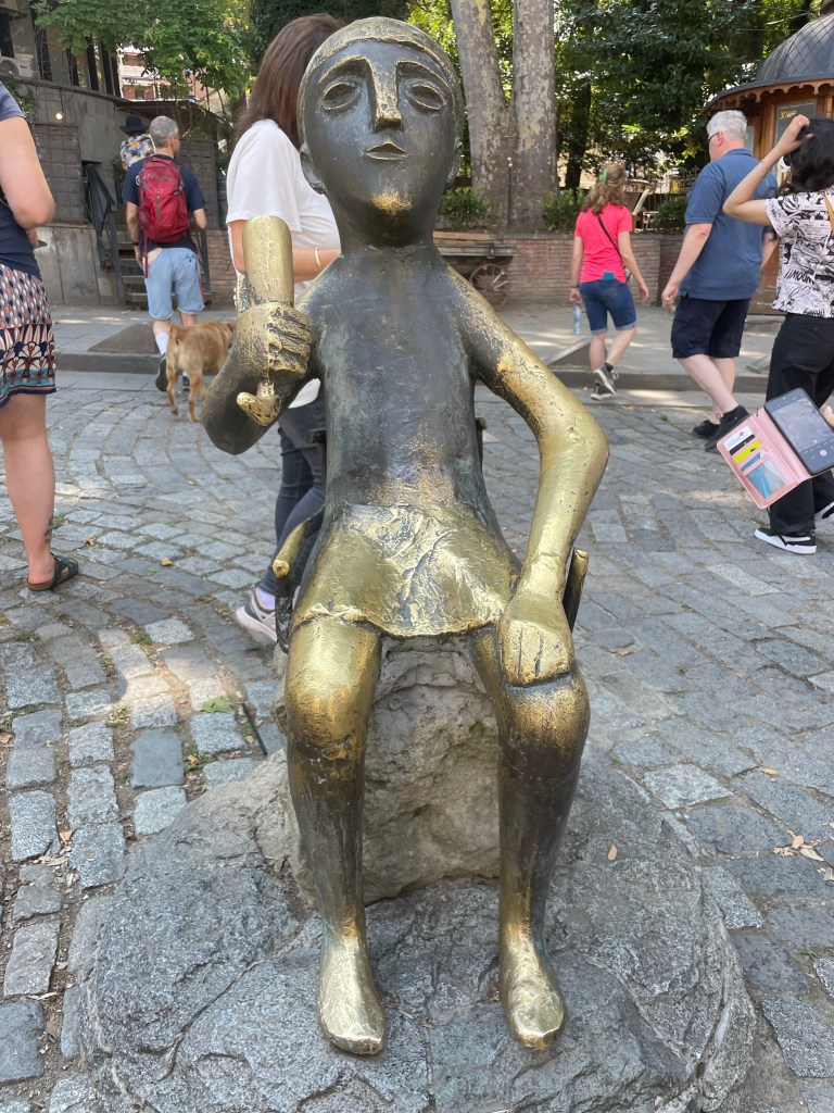 Heute Vormittag machten wir uns zunächst auf eigene Faust auf den Weg und erkundeten die Gegend rund um den Rustaveli-Boulevard, eine Hauptstraße ähnlich den Champs-Elysées in Paris, auf der z. B. auch Georgiens Parlament liegt, vor dem interessanterweise die EU-Flagge weht. Ein Umstand, der uns schon vor vielen offiziellen Gebäuden aufgefallen ist! Die Mehrheit der Georgier wünscht sich auch den EU-Beitritt, aber die Regierungspartei (“Georgischer Traum”) ist wohl sehr durch Russland beeinflusst. In der Nähe unseres Hotels haben wir gestern noch ein solidarisches Hinterhof-Restaurant entdeckt, in dem explizit darum gebeten wird, Georgisch oder Englisch mit den Angestellten zu sprechen, kein Russisch! Die Kinder und jungen Menschen sprechen generell exzellentes Englisch – beispielsweise hat in Ushguli ein Junge im Grundschulalter die Zuteilung der ausländischen Passagiere an die Sammeltaxen organisiert – und Englisch hat Russisch als Fremdsprache in der Schule längst abgelöst. Andererseits lagen auf einem Bücher-Flohmarkt noch Ausgaben von “Mein Kampf” in der russischen Übersetzung aus und unser Fahrer gestern – laut eigenen Worten “unpolitisch” – entpuppte sich als Antisemit. Er hat uns gut und sicher gefahren und auch sonst Einiges über seine Sicht auf Georgiens Entwicklung erzählt. Ich hoffe nur für ihn, dass er keine Gäste aus Israel hat, denn Israelis scheinen hier viele Urlaub zu machen. Es sei nicht weit weg, schön, friedlich, und günstig im Vergleich zum Heimatland, erzählte uns eine israelische Familie in Adishi. Georgien ist wirklich ein Land voller Gegensätze!