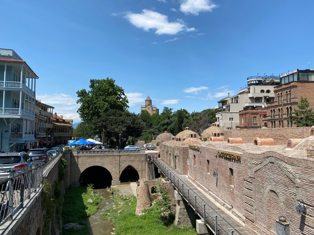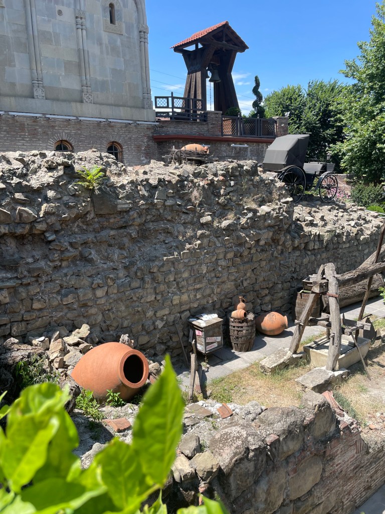 Um 12 Uhr ging dann die Free Walking Tour am Freiheitsplatz los, der nicht weit entfernt von unserem Hotel liegt. Einst als Leninplatz bekannt, ziert heute eine goldene Statue des Heiligen Georg die Mitte des geschäftigen Platzes, der für die Georgier so wichtig ist, dass viele Kinder nach ihm benannt werden. Auch Überreste der Stadtmauer sind in unmittelbarer Nähe noch zu finden – sie liegen etwas unscheinbar unterhalb eines Subway-Restaurants.