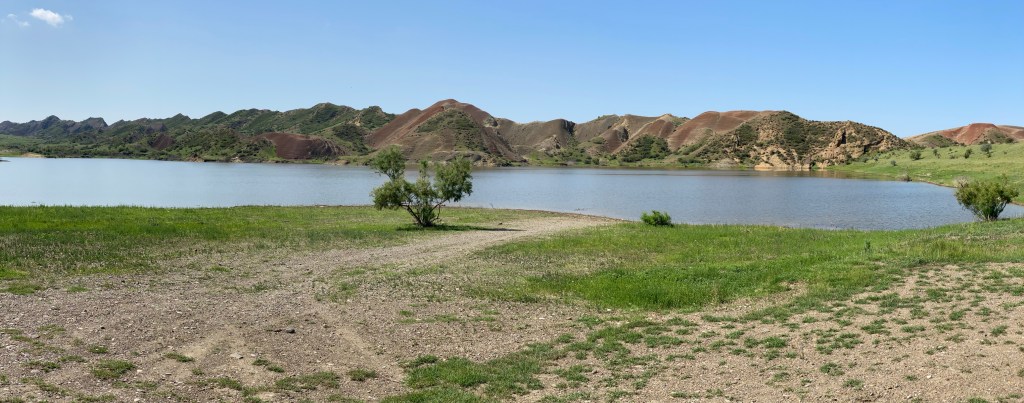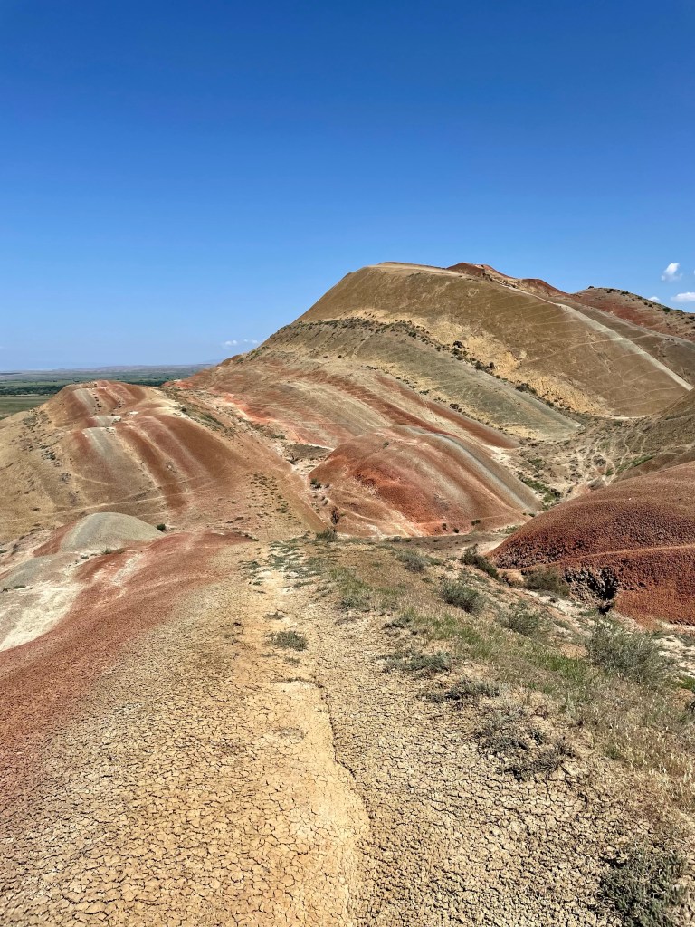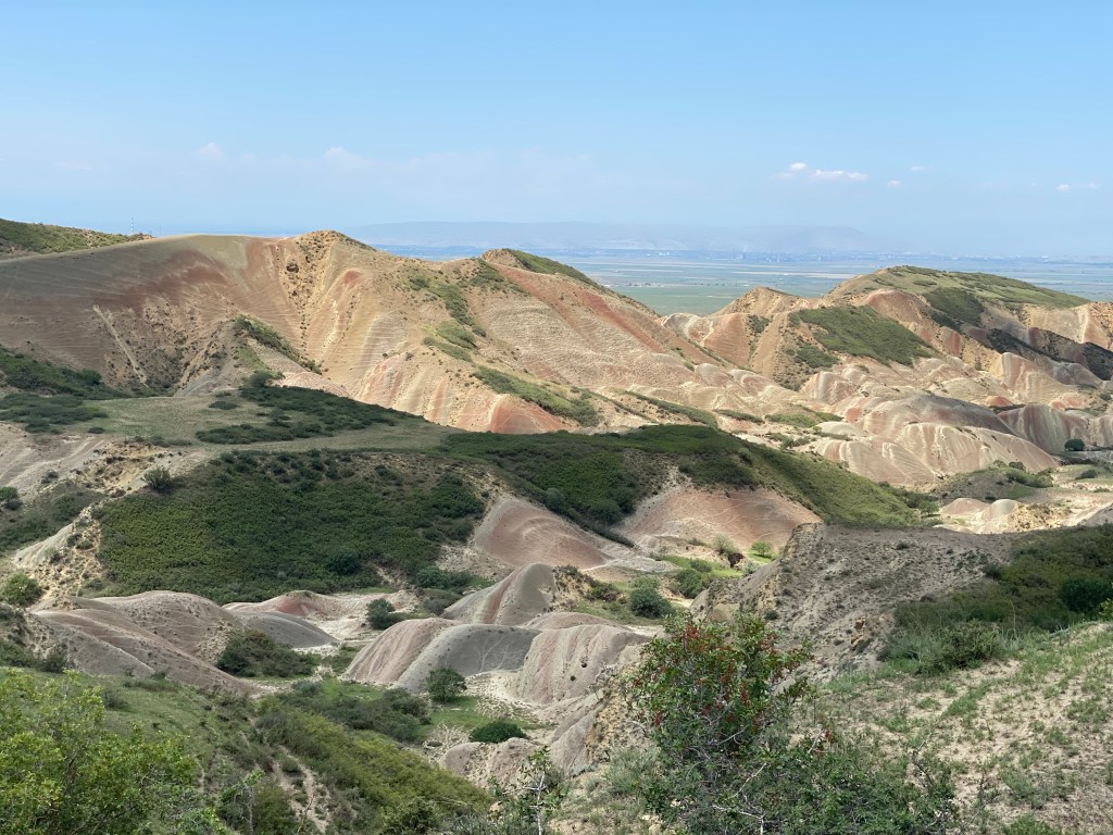 Ab da hörte die Plattenstraße auf und es wurde alles aus dem Offroad-Fahrzeug rausgeholt, was geht. Um kurz nach zehn erreichten wir unser erstes Zwischenziel, die sog. Rainbow Mountains, eine bizarr anmutende Landschaft in der Steppenwüste, die vergessen ließ, dass wir uns in Georgien und nicht etwa in Peru oder Island aufhielten. Warum, das siehst du auf den Fotos weiter unten… Hier machten wir eine kleine Wanderung. Währenddessen wurde es zunehmend heißer, auch wenn wir wohl noch Glück hatten, da es normalerweise im Juli dort schon viel wärmer sei, wie unser Guide berichtete. Am beeindruckendsten fand ich es, den Segelflug eines Bartgeiers über der hügeligen Landschaft zu beobachten.