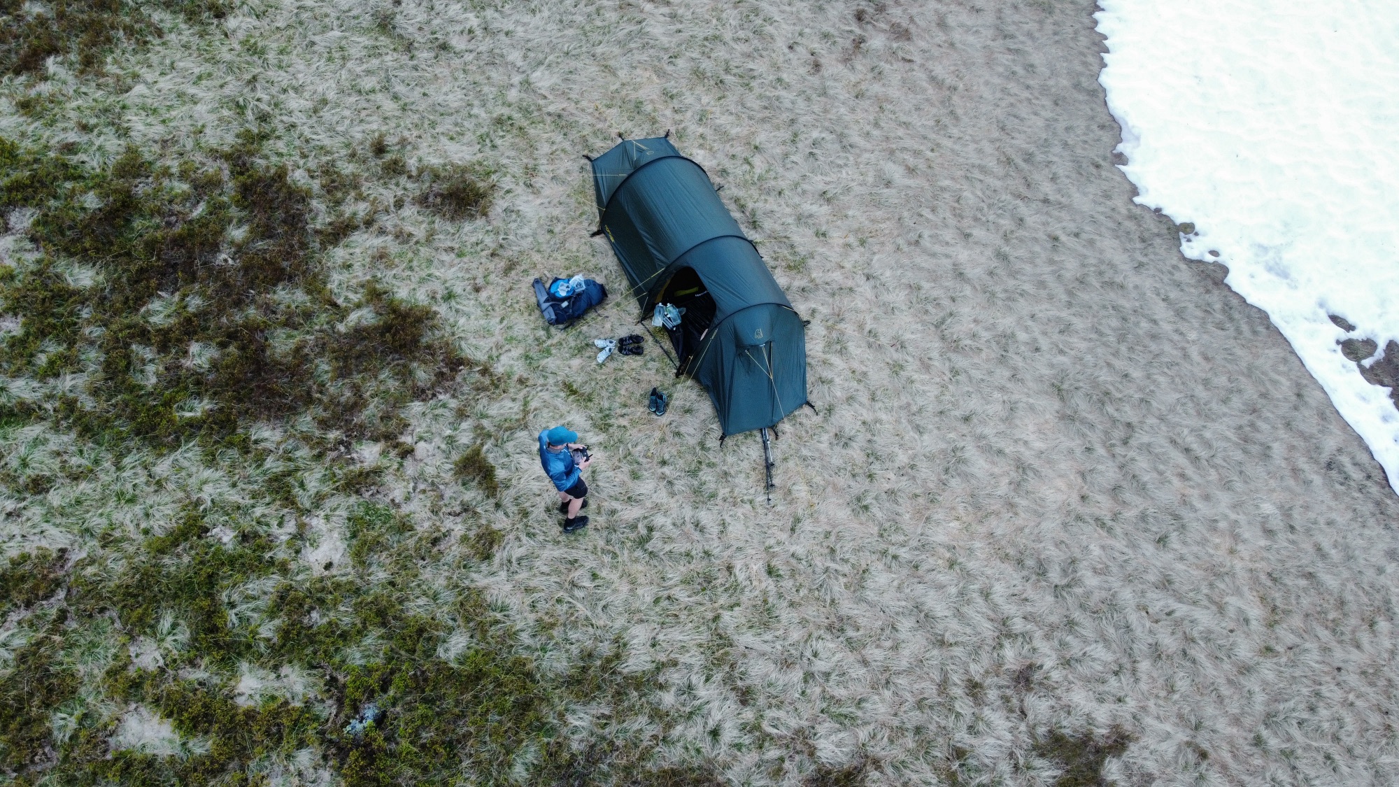 Um 18 Uhr beschlossen wir, unser Zelt aufzuschlagen. Eigentlich wollten wir weiterkommen, aber der Weg führte wieder höher und durch zunehmend mehr Schneefelder, sodass wir beschlossen, nach 14,5 km Pause zu machen. Im Nieselregen bauten wir das Zelt auf, holten Wasser für das Abendessen, gingen für die obligatorische Katzenwäsche mit Schmelzwasser zum Bach in der Nähe (man muss sich ja gegenseitig noch riechen können :P) und danach erstmal in den Schlafsack zum Aufwärmen. Wir genossen unsere Pasta mit Erbsen und Walnüssen und den Himbeer Crumble zum Nachtisch (übrigens auf gefriergetrockneter Basis) und schliefen satt und zufrieden ein.