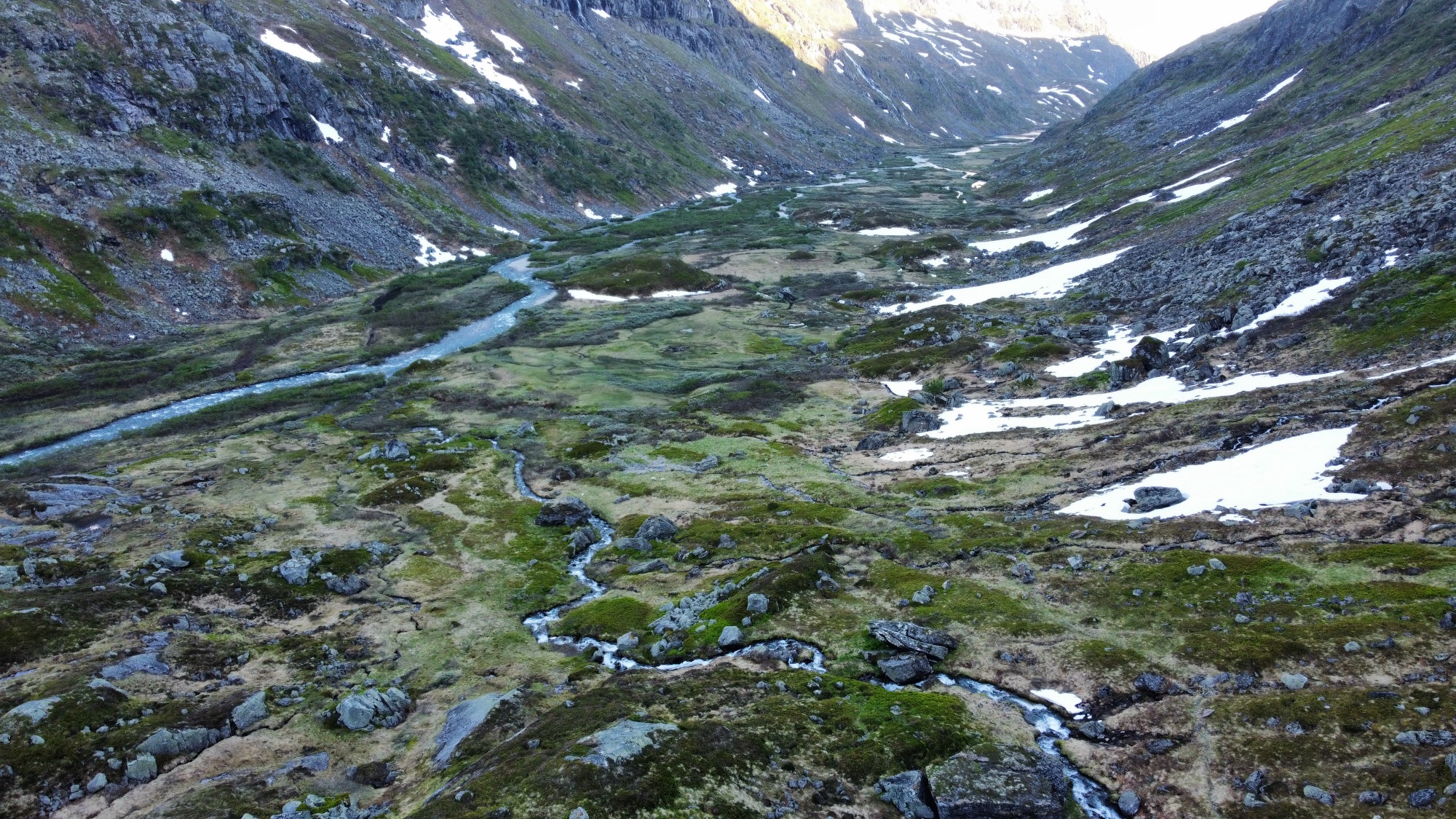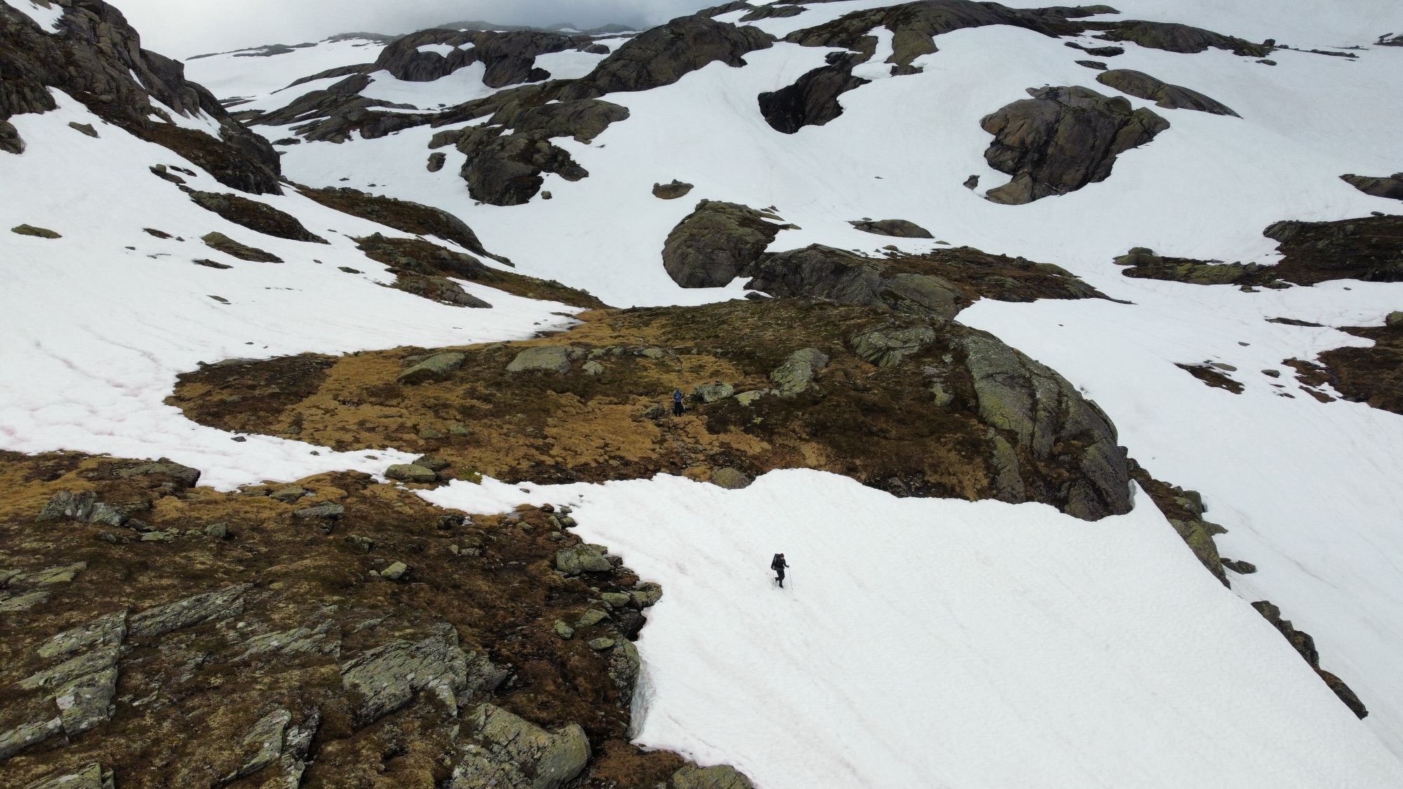 Im Abstieg klarte es auf und vor unseren Augen eröffnete sich eine grandiose Aussicht. Über das große Schneefeld (an der Nordseite war die Schneedecke noch wesentlich höher als an der Südseite) ging es fix bergab und wir fanden kurz hinter dem Bergpass wie geplant einen schönen Zeltplatz nach etwa 16,5 km an diesem Tag. Auch die Sonne ließ sich wieder blicken und so wurde es schnell murkeliges warm im Zelt. Wir genossen unseren letzten Abend im Fjell mit einer Portion Jägertopf, Tee und Krimi hören zum Einschlafen.