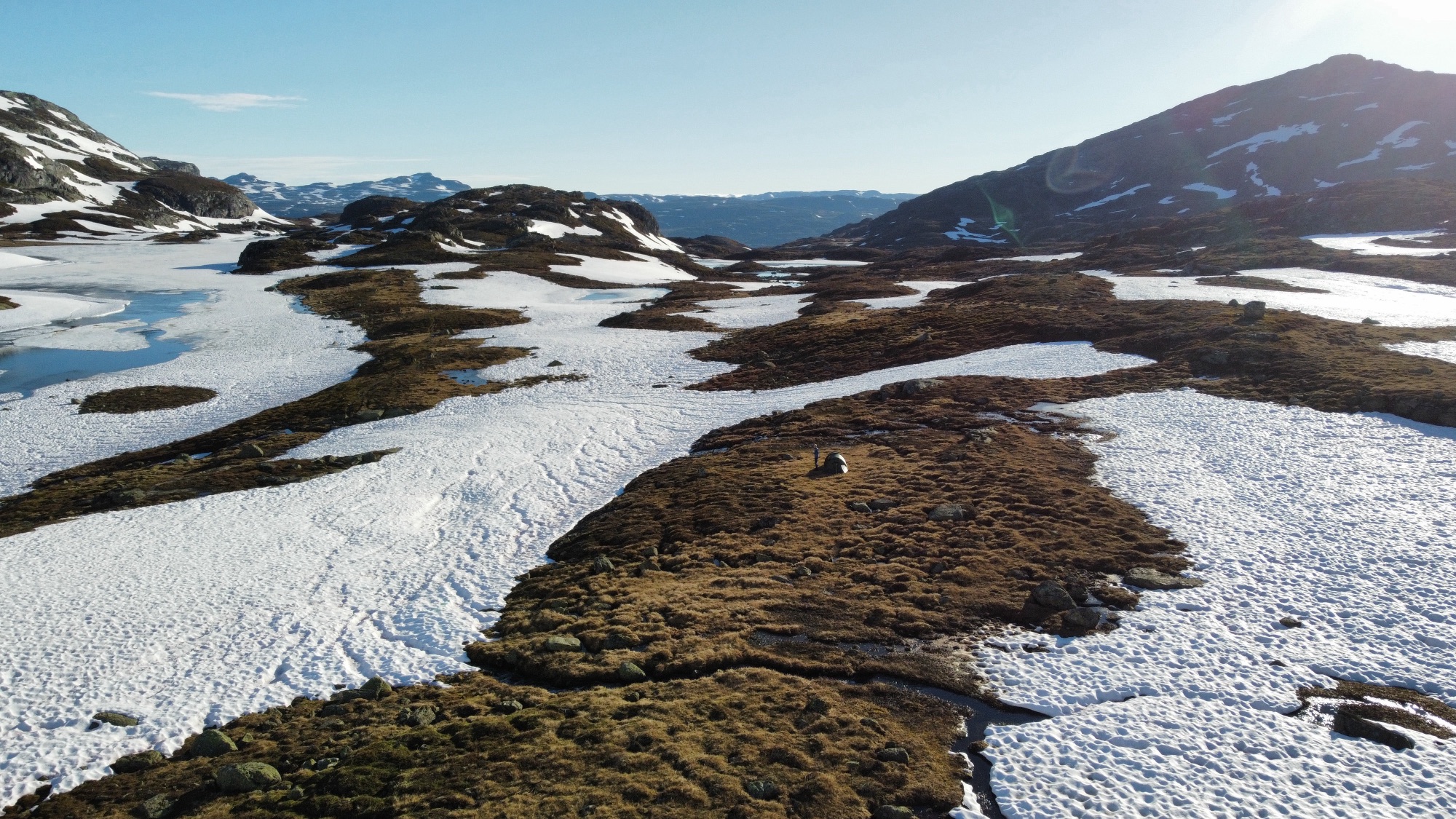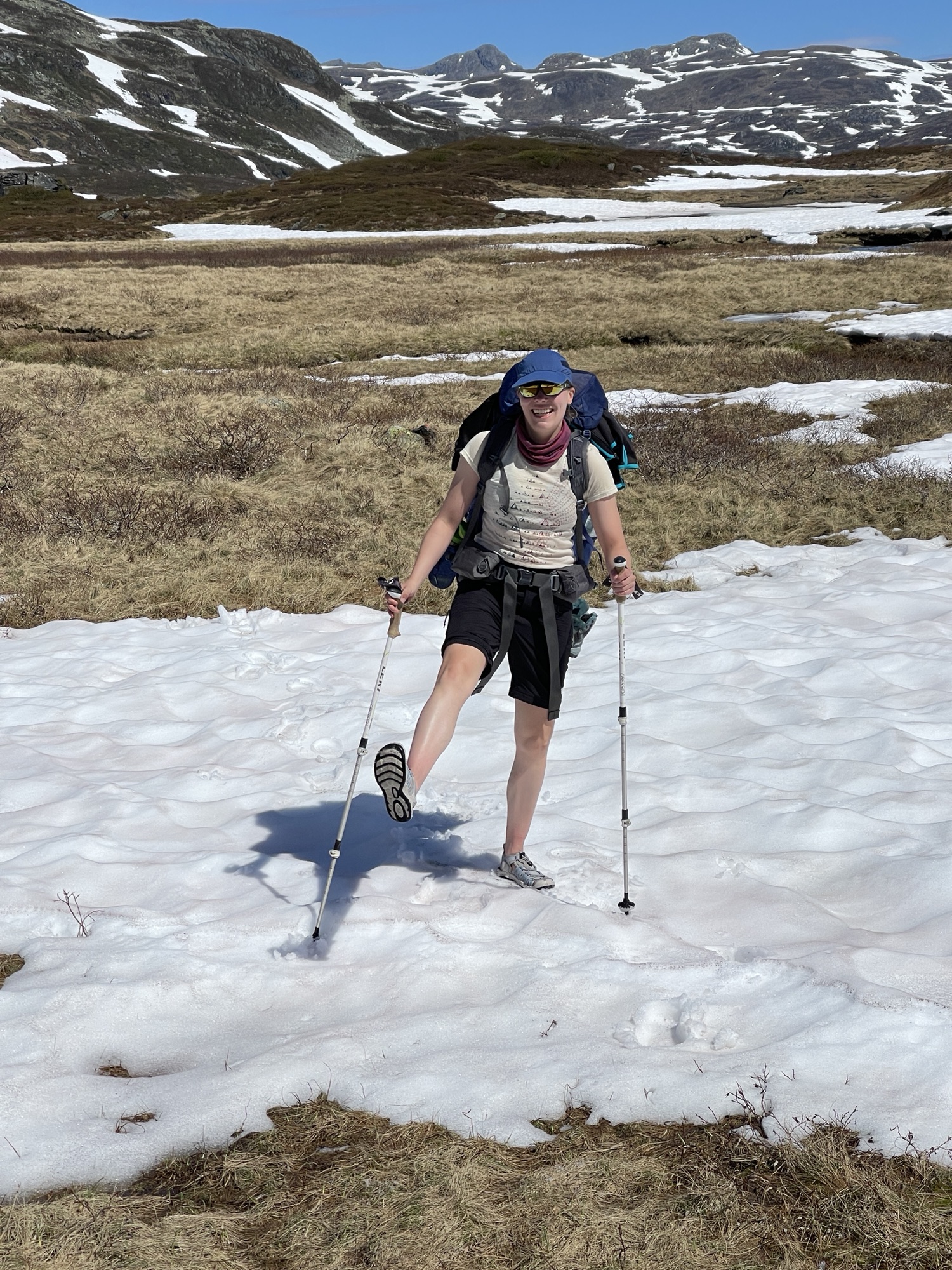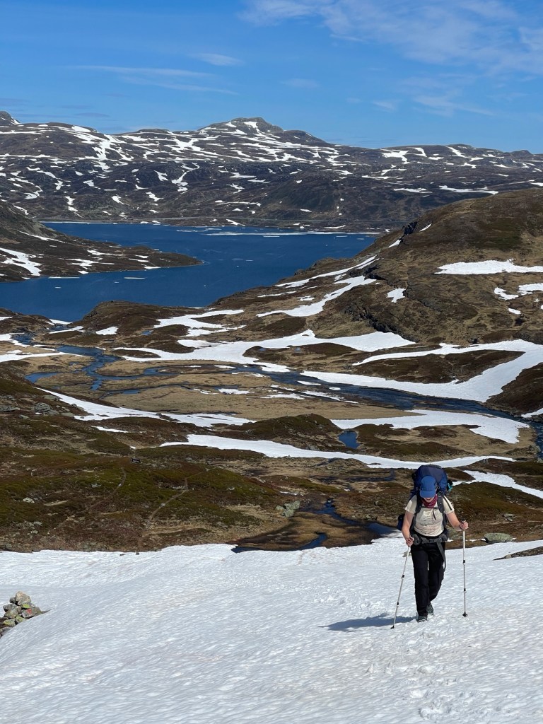 Mit den ersten Höhenmetern mussten auch die ersten Schneefelder gequert werden – dank unserer Trekkingstöcke und weil der Schnee noch recht griffig war, stellte das allerdings kein Problem dar. Hinter uns erhoben sich die mächtigen Gipfel der Hardangervidda.