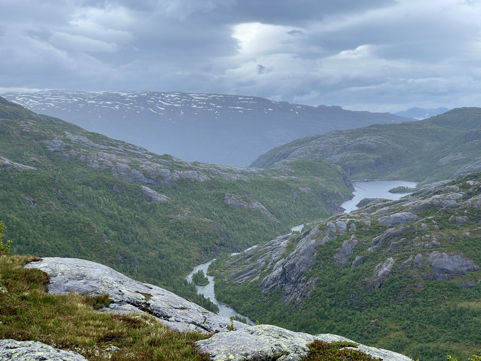 Im weiteren Verlauf wurde es nicht einfacher. Es ging zwar beständig bergab, aber zwischendurch, der Topografie geschuldet, auch immer mal wieder hoch mit einigen ausgesetzten Passagen, die mit leichterem Gepäck sicher einfacher zu bewerkstelligen gewesen wären, mit vergleichsweise schwerem Trekkingrucksack aber allerhöchste Konzentration und Ruhe erforderten. Als sich die Schlucht weitete und vor uns das Tal Kvanndalen öffnete, waren wir sehr froh und stiegen ab, bis wir die erstbeste (aber auch echt schöne) zum Zelten geeignete Stelle fanden. Es roch leicht nach Schafscheiße, aber das war uns egal, als wir nach etwas über 18 km gegen 20 Uhr unser Zelt aufbauten. Rasch kühlte es ab und wir kuschelten uns nach einem leckeren Essen samt Nachtisch in unsere Schlafsäcke. So ist übrigens auch mein Traum in Erfüllung gegangen, Mittsommer in Skandinavien unter freiem Himmel und bei gutem Wetter zu verbringen ;).
