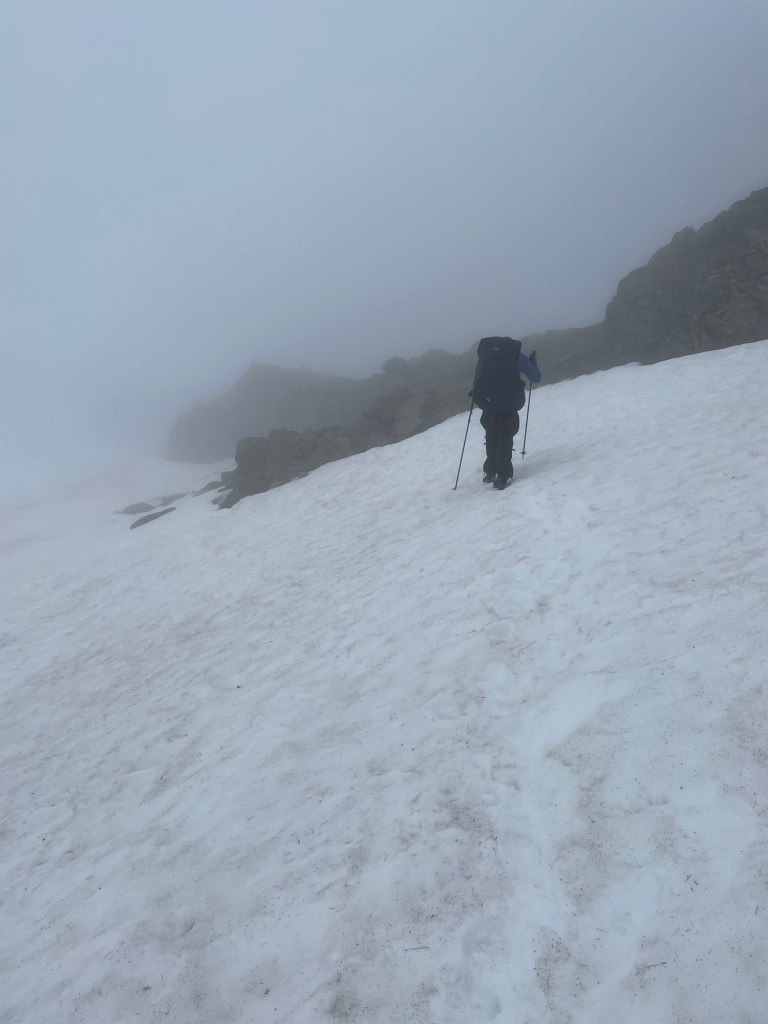 Nach den Herausforderungen des zweiten Tages wartete die nächste Challenge auf uns – finde den Weg bei schlechter Sicht plus vielen Schneefeldern. Bis zum frühen Nachmittag waren wir immer auf der Suche nach dem nächsten roten T (so sind hier die Wanderwege markiert), denn bei Sichtweiten von geschätzt 50 Metern half es nichts, zu versuchen, die Landschaft zu lesen. Auch unser GPS Gerät half uns an der einen oder anderen Stelle weiter. Es ging neben sketchy Schneebrücken wieder über blanken Fels, hier halfen die Wanderstöcke und Ruhe bewahren.