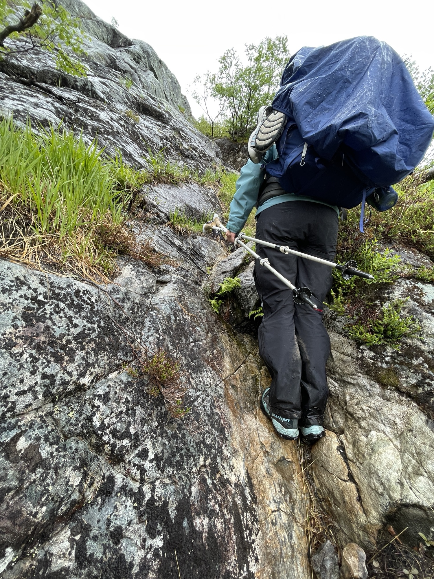 Es fing wieder an zu nieseln und die Aufgabe lautete: Vertikales Wandern, Bergsteigen – wie auch immer man es nennen mag. Auf 1,5 km galt es 300 Höhenmeter zu bewältigen, teilweise mit bis zu 40% Steigung. Ciao, Komfortzone, es wurde richtig haarig. Vielleicht kennt der/die eine oder andere von euch diesen glatten skandinavischen Fels, den man auch häufig in den Schären findet – der bei Regen richtig schön nass und rutschig wird. Hier half nur Hochrobben, Durchatmen, jeden Schritt für sich setzen. An anderen Stellen bot der Fels mehr Reibung bzw. Griffe, aber eigentlich wollte ich nicht mit 15kg auf dem Rücken Bouldern gehen.