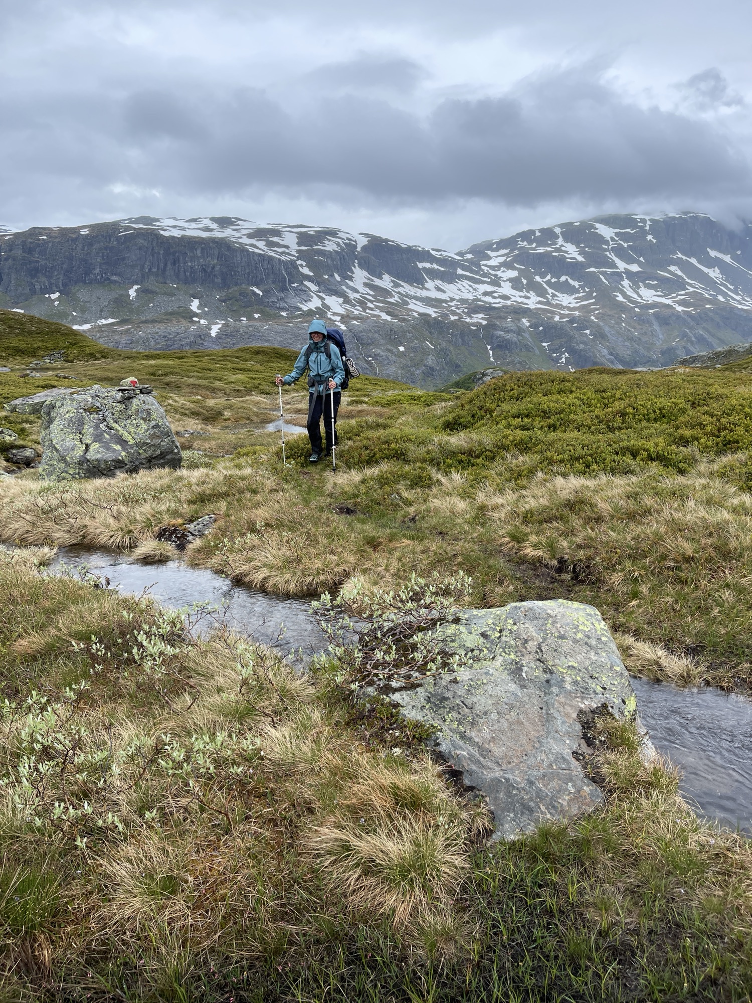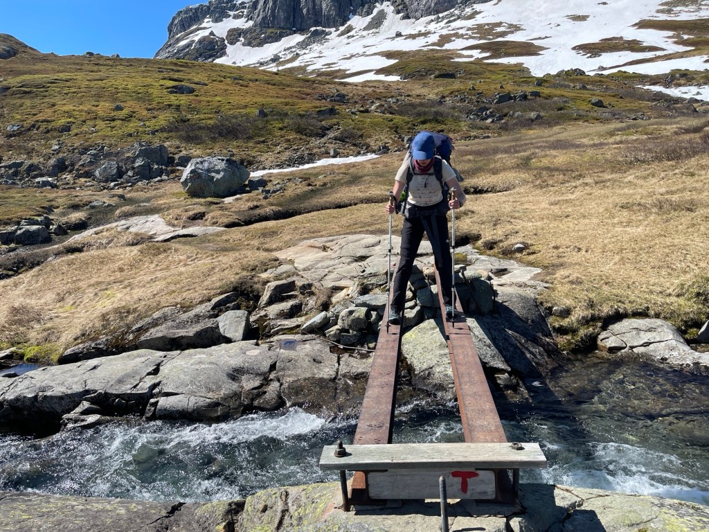 Später wurde der Weg etwas nervig (viele Steine und Sträucher), sodass wir für insgesamt 10,5 km doch etwas länger benötigten als geplant. Nachdem wir eine interessante Brücke passiert hatten, begegneten uns auch wieder mehr Wanderer, die vermutlich das gute Wetter abgepasst hatten oder als Tageswanderer von Haukeliseter aus unterwegs waren.