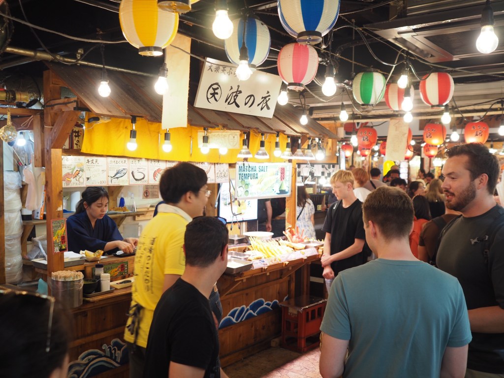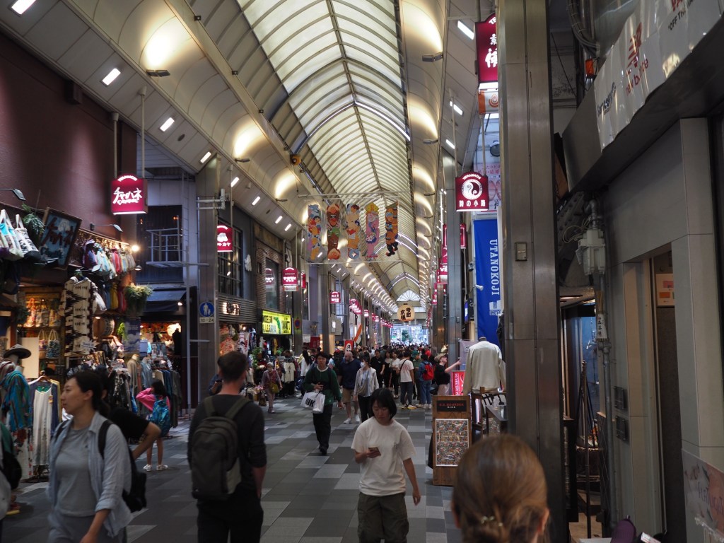 Nachdem wir unsere Sachen am Hotel abgelegt hatten (unsere Koffer waren schon auf unserem Zimmer, Gepäckversand sei Dank), gingen wir zu Fuß zum nahegelegenen Nishiki-Markt. Erster Eindruck: Heller und geordneter als der Markt in Osaka, aber irgendwie auch polierter und nicht ganz so authentisch (hübsch gemacht für die Touristen). Aber es gab Leckeres zu Futtern (auch wenn Kyoto Osaka in punkto Streetfood nicht die Fahnenstange hält).