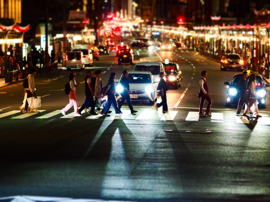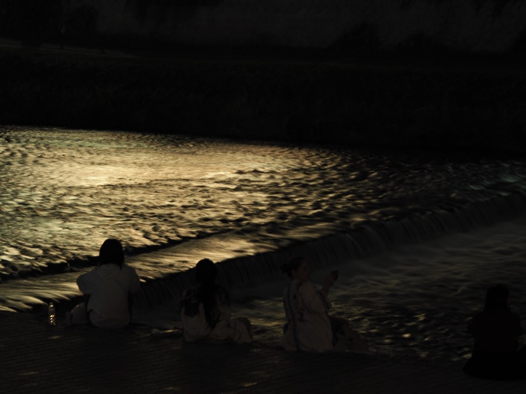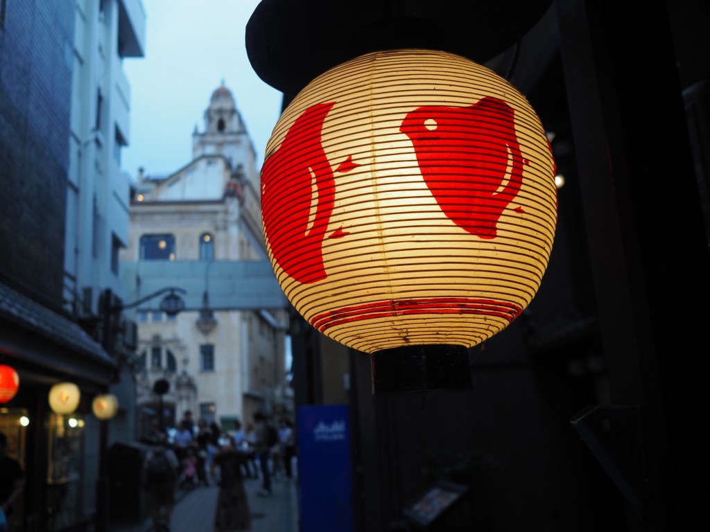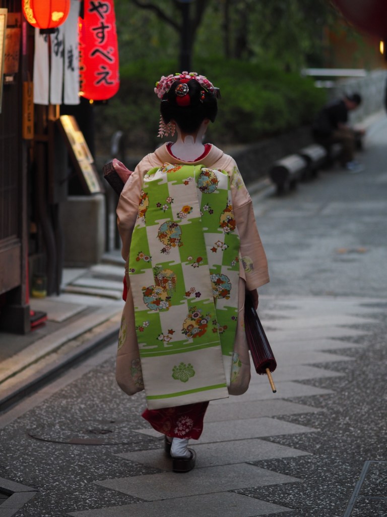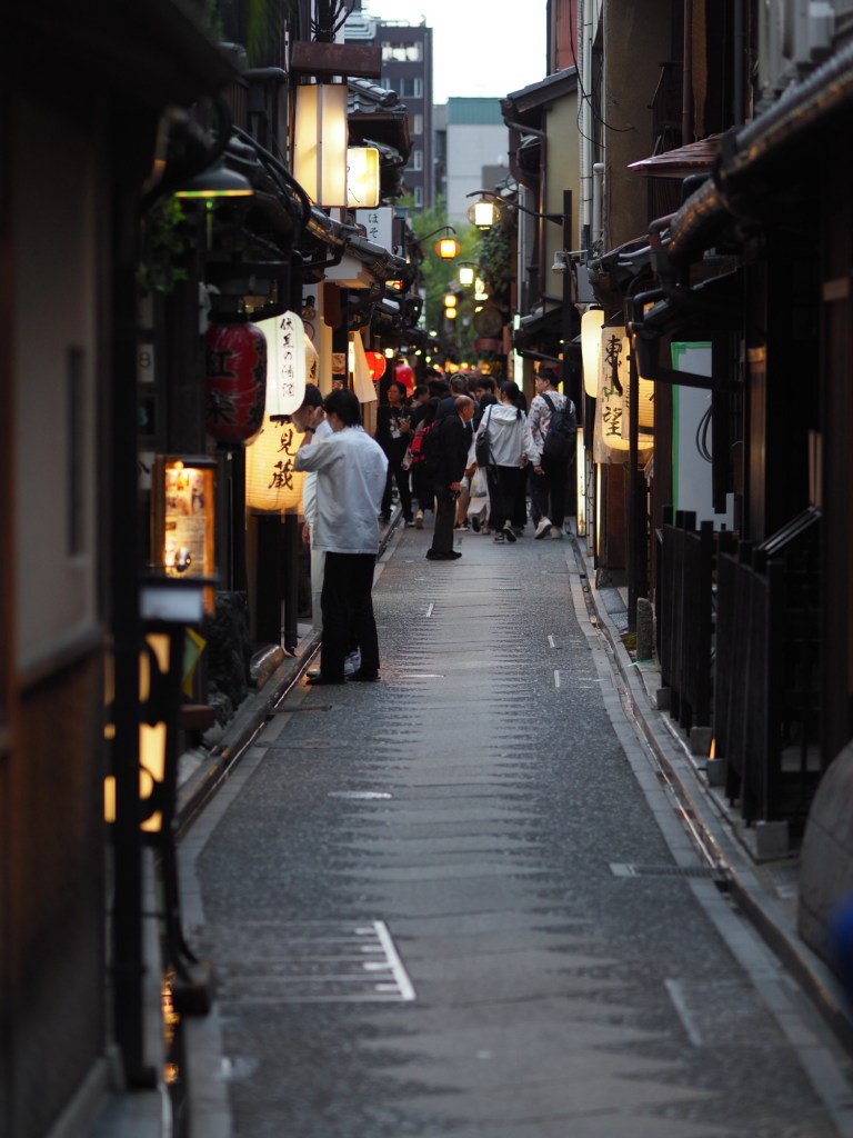 Von dort aus ist es nicht weit zum Pontocho- und Gion-Viertel am Ufer des Kamo-gawa-Flusses, dem Ort, an dem man Geishas (die man in Kyoto übrigens Geikos nennt) sehen kann und an dem es neben teuren Restaurants auch viele Teehäuser und Bars gibt. Das Ganze hat uns ehrlich gesagt nicht völlig vom Hocker gehauen, aber die Stimmung bei der einsetzenden Dämmerung, als die Lichter angingen, war reizvoll. Einige Geishas sichteten wir auch, aber diese schienen in großer Eile zu sein und rannten förmlich auf ihren Holzsandalen die engen Gassen rauf und runter.