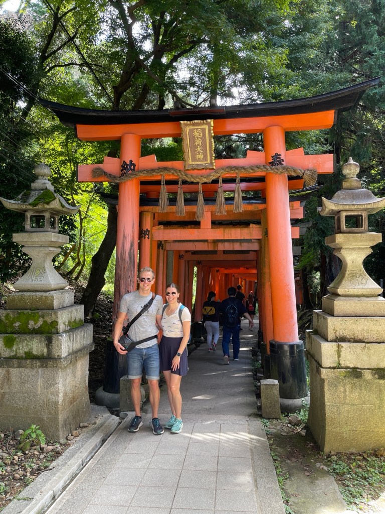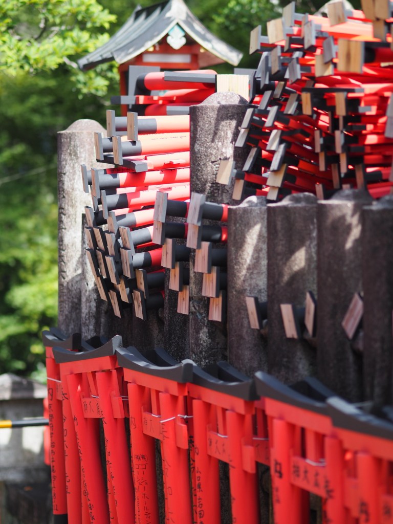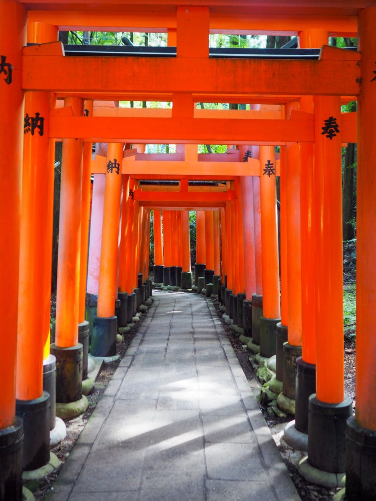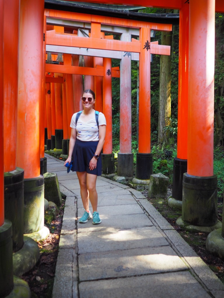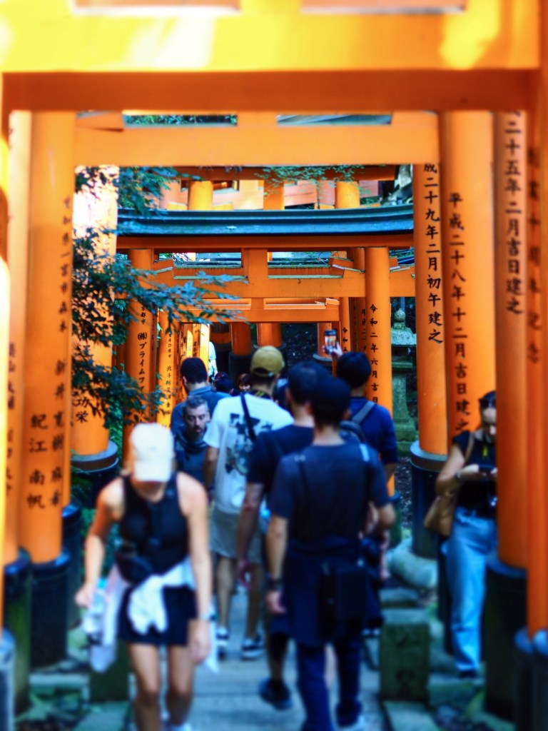 Heute Morgen ging es für uns pünktlich um sieben Uhr aus dem Bett – denn der Tipp aus dem Reiseführer lautete: Zu den Top-Attraktionen in Kyoto sollte man früh kommen – ich fand ehrlich gesagt, gegen kurz nach neun ist eher früh, dennoch war es schon proppenvoll am berühmten Fushimi Inari Taisha Schrein, der im Südosten der Innenstadt liegt. Am Anfang mehr ein Geschiebe und Gedränge, mit den Höhenmetern wurde es leerer in dem Tunnel zwischen den roten Torii (das sind die roten Tore aus Holz oder Stein, die man vor / bei Schreinen sieht).
