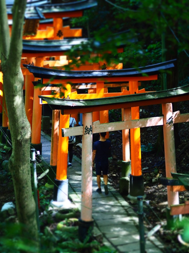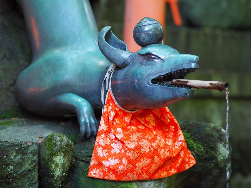 Der Fushimi Inari Taisha Schrein wurde im achten Jahrhundert dem Gott des Reises und des Sake gewidmet, hat also etwas mit dem Thema Landwirtschaft zu tun, und besteht eigentlich aus fünf Schreinen, die sich am Berg hochschlängeln. Da der Fuchs als Botschafter des Gottes Inari (der Gott der Landwirtschaft) gilt, finden sich überall Fuchsstatuen. Füchse werden von Japanern als geheimnisvolle, neckische Wesen wahrgenommen – eben ein bisschen wie Gottheiten. Die Statuen haben häufig einen Gegenstand in der Schnauze, z.B. einen Schlüssel, und rote Lätzchen als Zeichen des Respekts umgebunden.