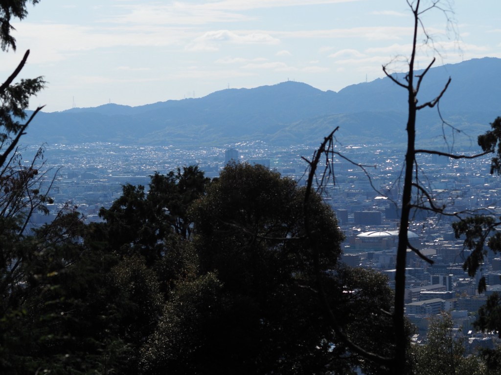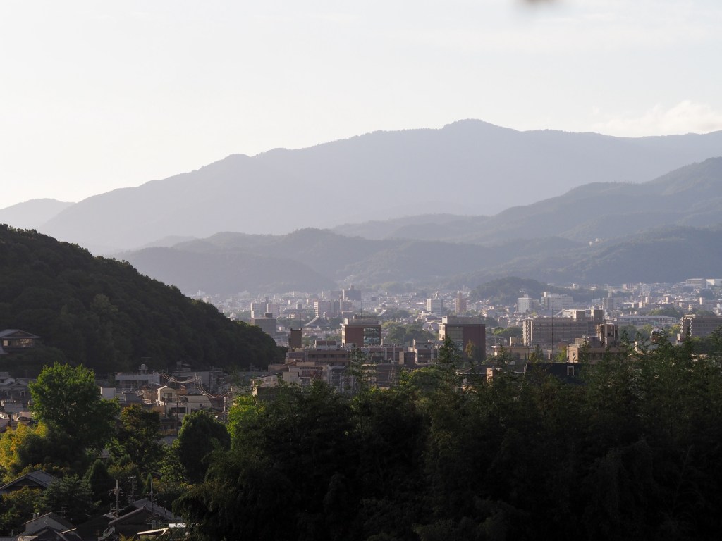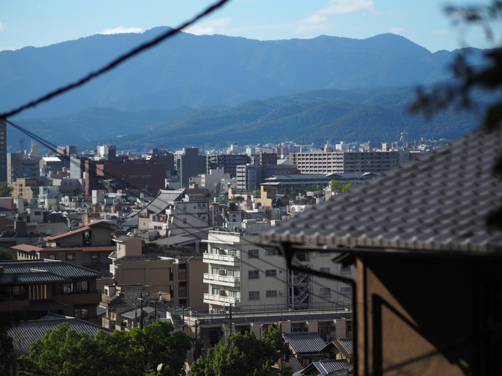Den Blick auf die Pagode mit den dahinterliegenden Berge und die vielen Menschen in Kimonos (kann man sich hier leihen und zurechtmachen lassen für Fotos) ließen wir schnell links (bzw. rechts) liegen und es ging alsbald einen ausgewaschenen Bergpfad hoch, umgeben von dichtem Wald, der Schatten spendete (heute hatten wir wieder sonnige 25 bis 30 Grad). Wie sich herausstellte, waren wir auf dem Kyoto Trail unterwegs, einem Wegenetz um die Stadt herum. Schnell verschwommen auch die Geräusche der Stadt zu einem Rauschen, bis wir schließlich nur noch das Trillern und Zwitschern verschiedener Vögel und der Zikaden hörten.