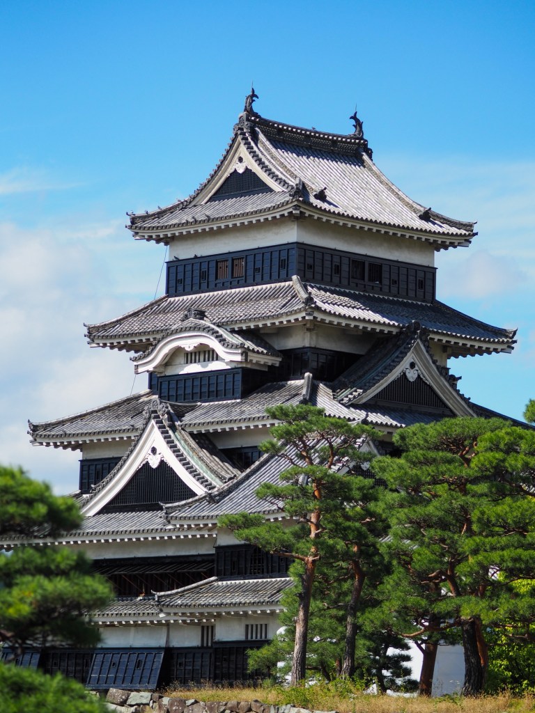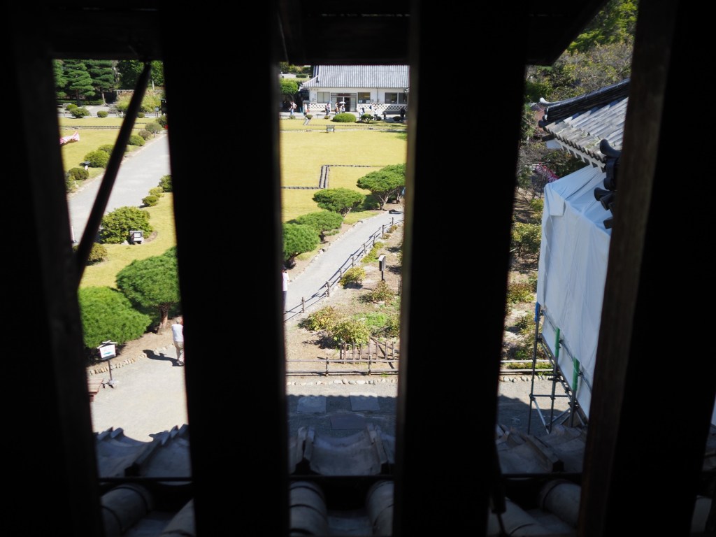 Wenn man die Burg besichtigt, kann man ganz bis zum höchsten Turm aufsteigen, von dem aus man ein großartiges 360 Grad Panorama auf Matsumoto und die umliegenden Berge hat. Die Treppen sind allerdings sehr steil und die Treppenstufen z.T. so hoch, dass die Schulkinder, die die Burg besuchten, diese auf dem Popo runterrutschen mussten.