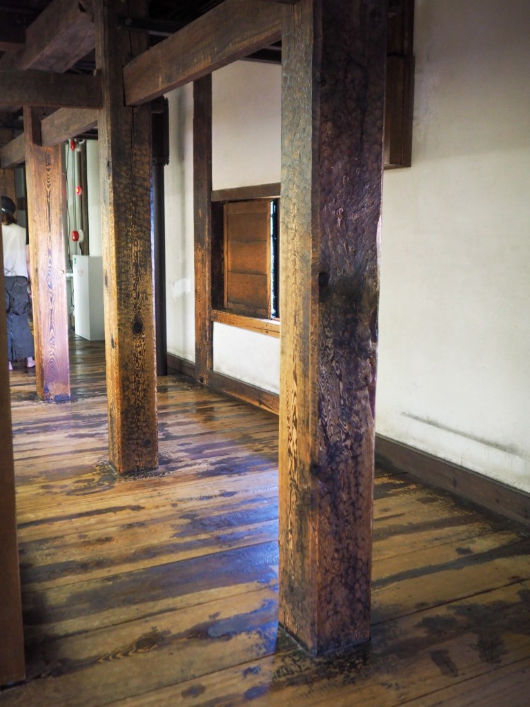 Außerdem sind im Inneren des tenshu, des Hauptturms in der Mitte, kriegsgeschichtliche Artefakte ausgestellt. Teile der Burg wurden zu Kriegs- und andere zu Friedenszeiten errichtet und das merkt man auch ganz deutlich. So lernten wir auch, dass Samurai durchaus mit Schusswaffen kämpften (irgendwie habe ich die in meiner Vorstellung immer mit so gebogenen japanischen Schwertern assoziiert.