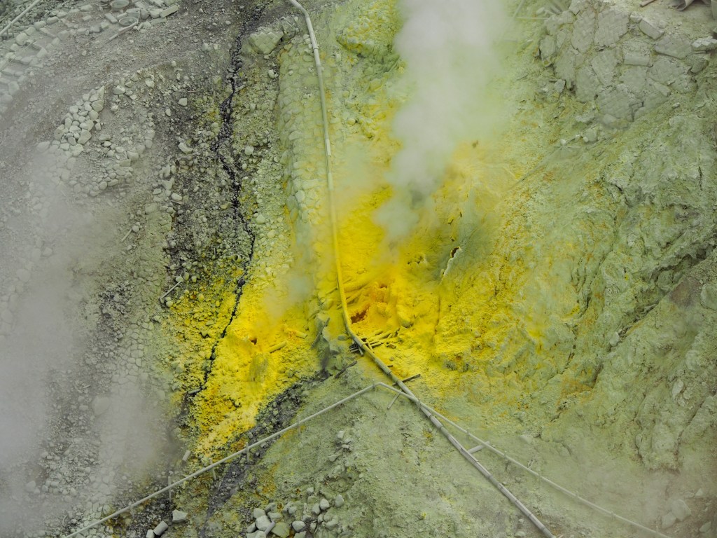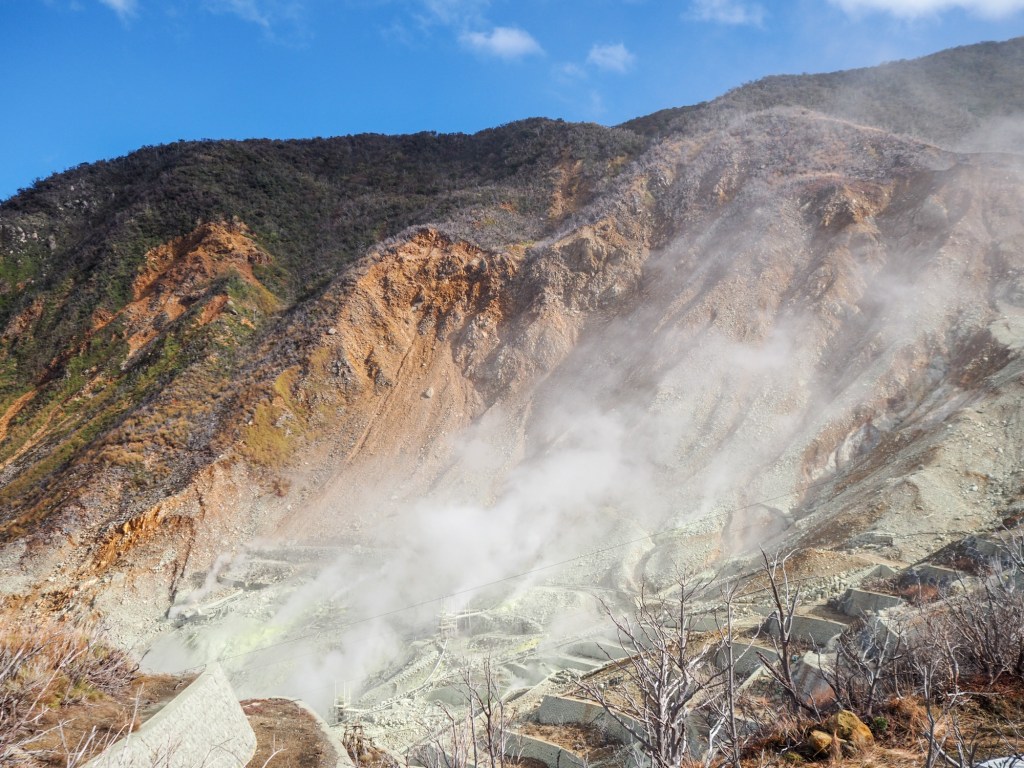 Beim Aussteigen aus der Gondel zog uns sofort der Geruch nach Schwefel in die Nase. Mit vorheriger Genehmigung kommt man im Rahmen einer kleinen Wanderung auch ein bisschen näher an die Fumerolen heran. Das passte heute zeitlich nicht für uns, wir testeten stattdessen die lebensverlängernden schwarzen Eier (s. Food of the Day), bevor es weiter zum Ashi-See ging.