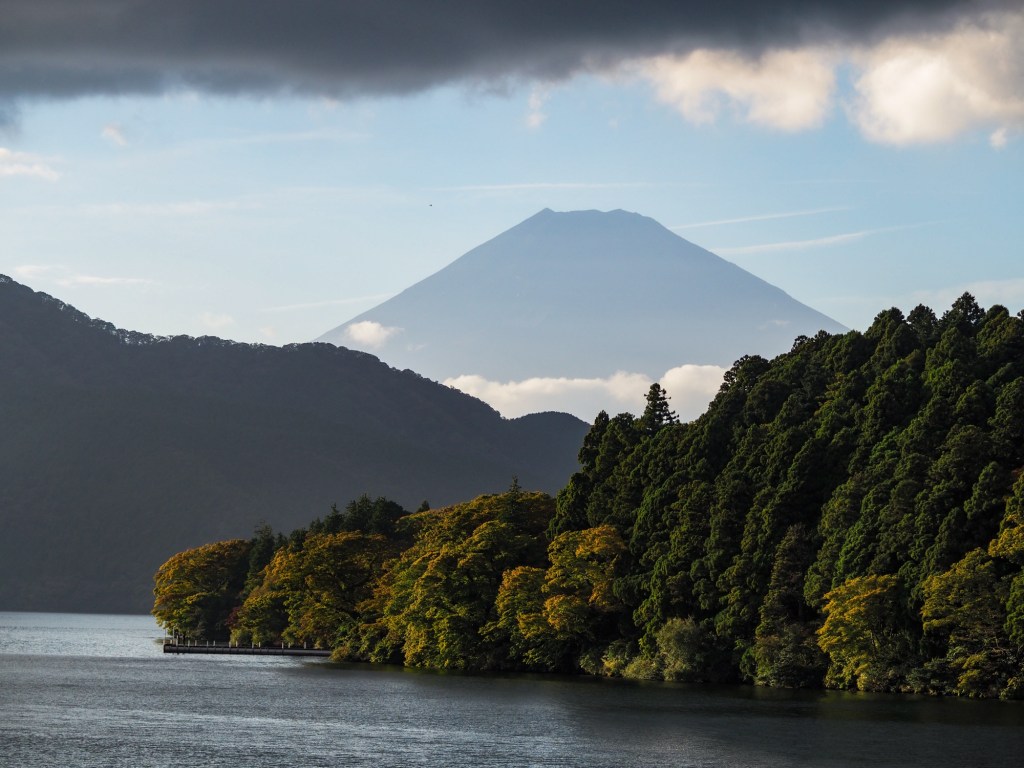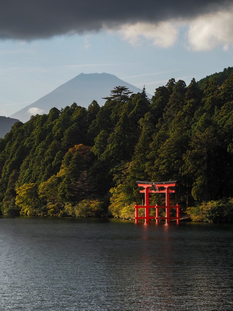 Vom Deck hatten wir auf jeden Fall einen guten Blick auf das Seeufer. Wir starteten bei bewölktem Himmel, aber als wir fast das Südufer erreicht hatten, riss der Himmel auf und da sahen wir es endlich: das markante Profil des Fuji-sans, wie es sich über dem See erhob. Ich kann wirklich verstehen, warum der Fuji mit seiner perfekt geometrischen Form eine solche Faszination auf die Menschen ausübt und obwohl es in Hakone viel Spannendes zu sehen gibt, war das schon das i-Tüpfelchen eines schönen Tages für mich!