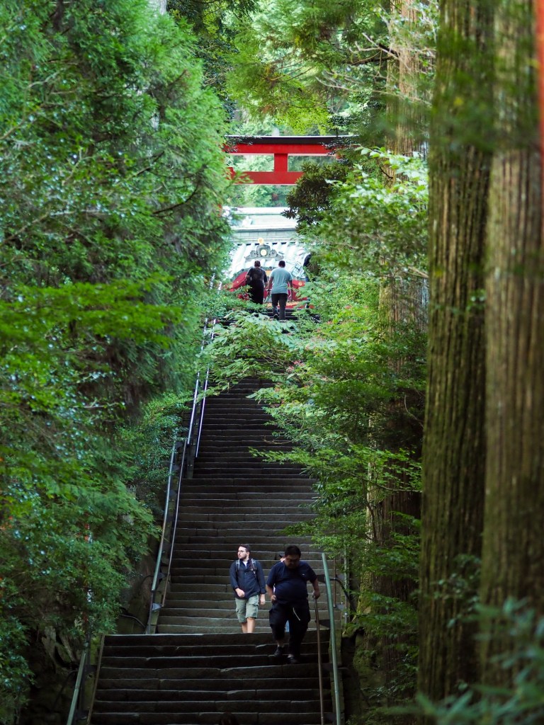 Nach ca. zwei Stunden erreichten wir Odawara, wo wir in die Hakone-Tozan-Bahn nach Gora umstiegen. Die Waggons dieser Bahn sind extra klein konstruiert, denn sie überwindet auf 15km 527m Höhenunterschied. Dabei macht sie drei Mal einem Switchback (also fährt Serpentinen „rückwärts“ hoch). Die Lok sprüht Wasser auf die Gleise, um den Verschleiß zu mindern, wenn der Zug die extrem engen Kurven durchfährt. Auf dieser Strecke gibt es übrigens auch den zweitsteilsten Anstieg einer solchen Bahn weltweit. Wahrer Bahn Porn also 😅.