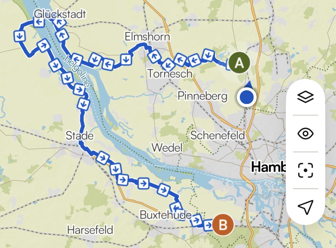 Manchmal liegt das Glück ganz nah… in diesem Fall auf dem Sattel unserer Gravelbikes auf der ersten großen Ausfahrt des Jahres. Eine Tour, die sich beliebig abkürzen und unterbrechen lässt und deren Start- und Zielorte mit den Öffis zu erreichen sind – also auch durchaus geeignet für ein Bike-Wochenende oder mit Kindern. 125 km von Quickborn über Elmshorn, Glückstadt, Wischhafen, Krautsand, Stade, Jork und schließlich Harburg – wer will, kann dann noch weiter radeln.