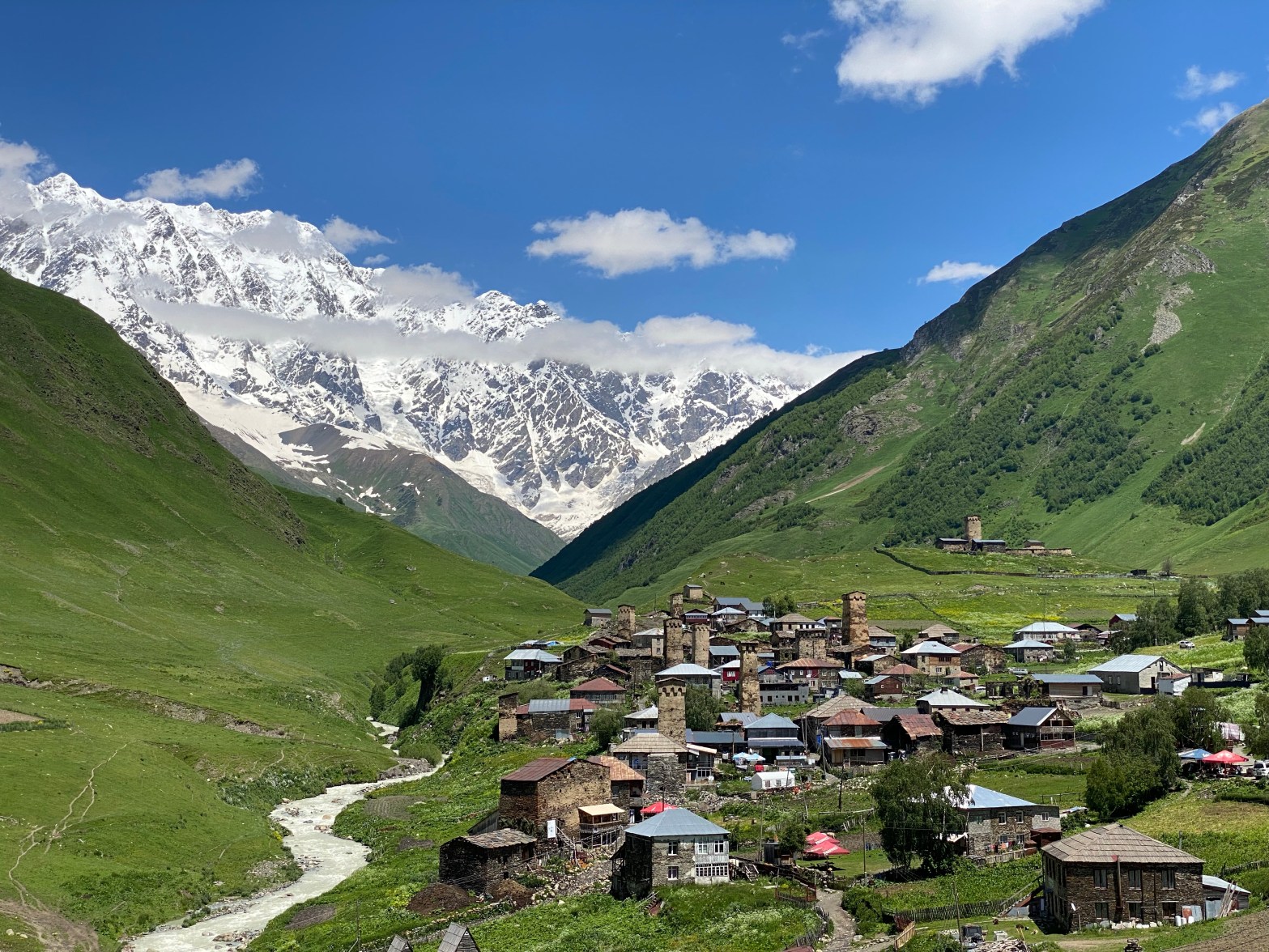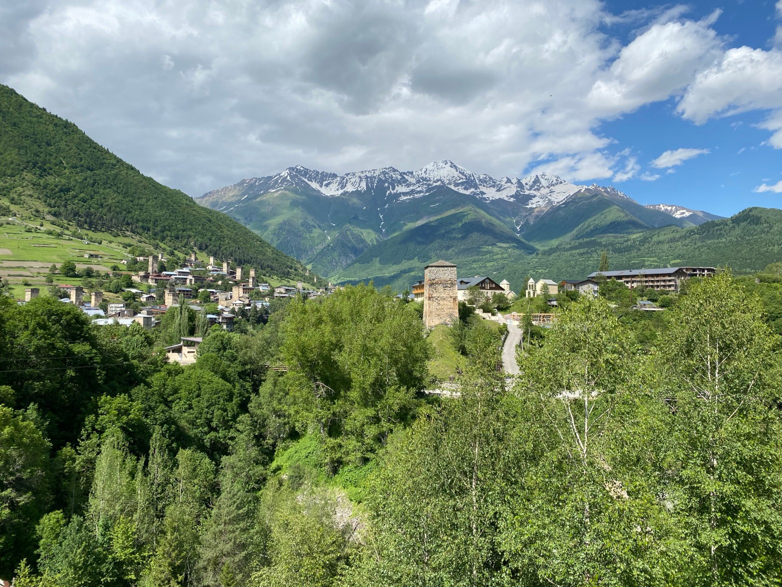 Nachdem wir gestern durch ein Missverständnis noch den Gesängen und Tänzen eines georgischen Männerchors beiwohnen durften (in diesem Fall ein glücklicher Zufall), ging es heute Morgen nach einem sehr reichhaltigen Frühstück inkl. Brotzeittüte auf zu ersten Etappe unserer Wanderung von Mestia nach Ushguli. Eine echte Genusswanderung von Dorf zu Dorf mit tollen Panoramen auf die Täler und Gipfel Swanetiens!
